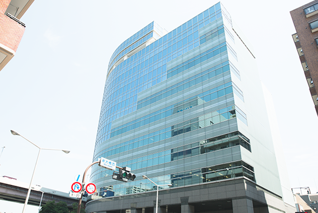 1つ目の信号がある大通りを左に曲がり、新大橋西の交差点の角のビルになります。弊社の受付は7Fになります。
